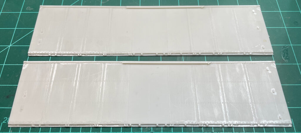 Many years ago, when I thought I was going to model the Great Northern, Sunshine released kits for the plywood cars built in the 40s. I wanted to add a level of accuracy so Martin sent me a side and I tortuously used my milling machine’s XY table and a needle in the Chuck to emboss simulated nail holes in the surface. Martin released this as a “distressed” kit and I was the beneficiary of lots of sets of these sides. Now that I no longer need that many they are excess and can be yours… $20 per set. I don’t know for certain but I would guess they can be used to replace the sides on the Intermountain kits, too. Details via this link